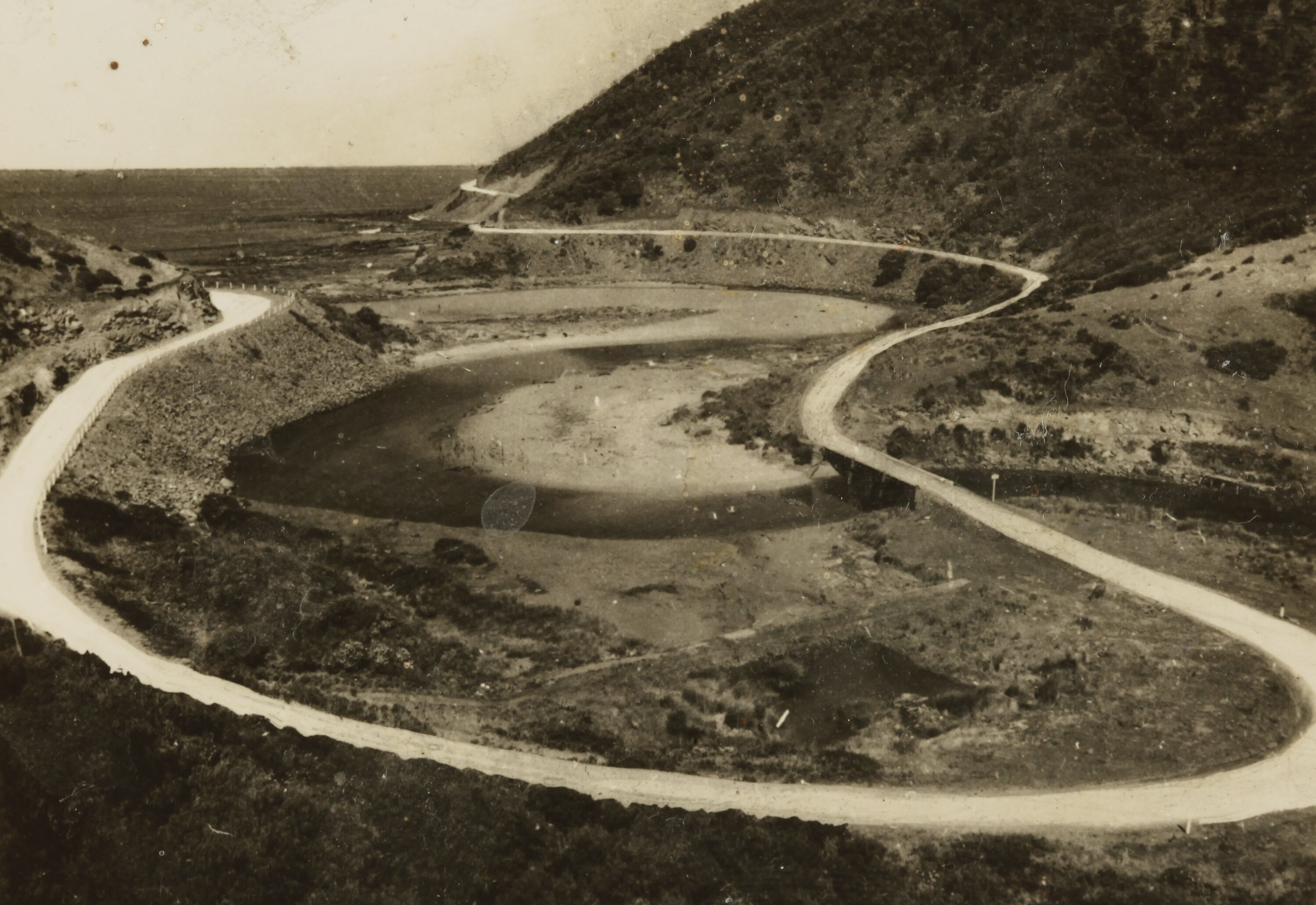 Black and white image depicting the mouth of the St George River, just south of the town of Lorne, with the Great Ocean Road winding around and over it. It is part of a collection of glass plate negatives, stereoscopic negatives, panoramas, postcards, photographs and cameras belonging to the William S Anderson Collection.