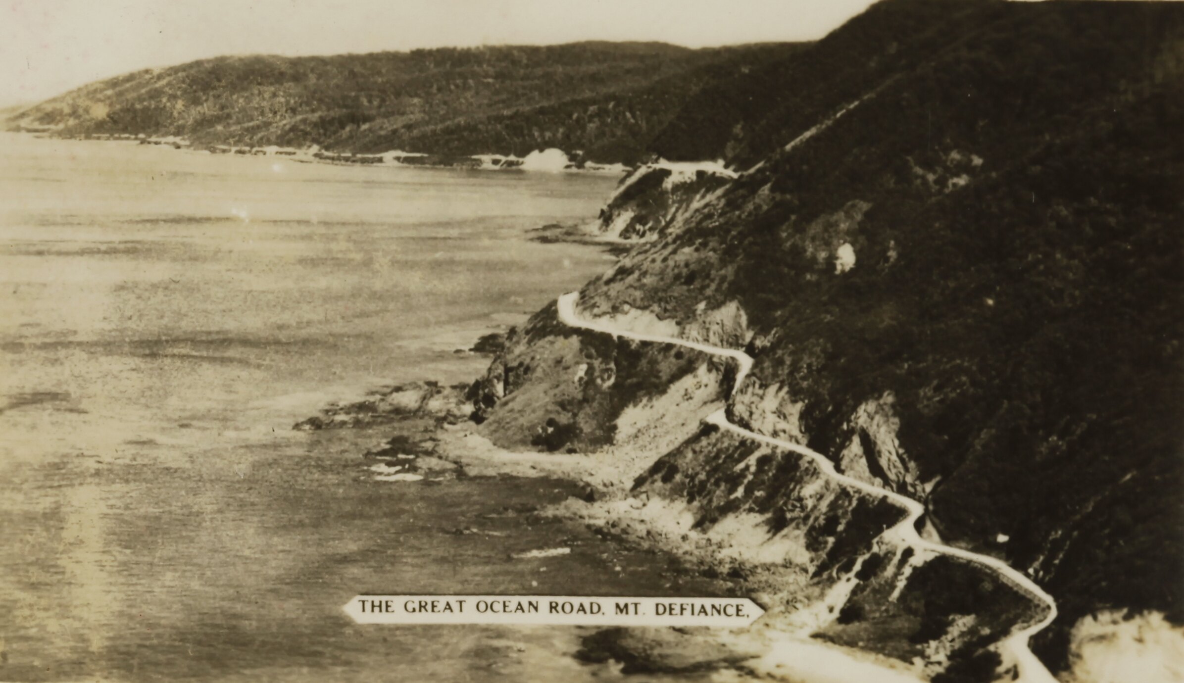 Printed in black ink on the front of photograph: 'GREAT OCEAN ROAD, MT. DEFIANCE.' Printed in black ink on the back of photograph: 'SELO (repeated)'