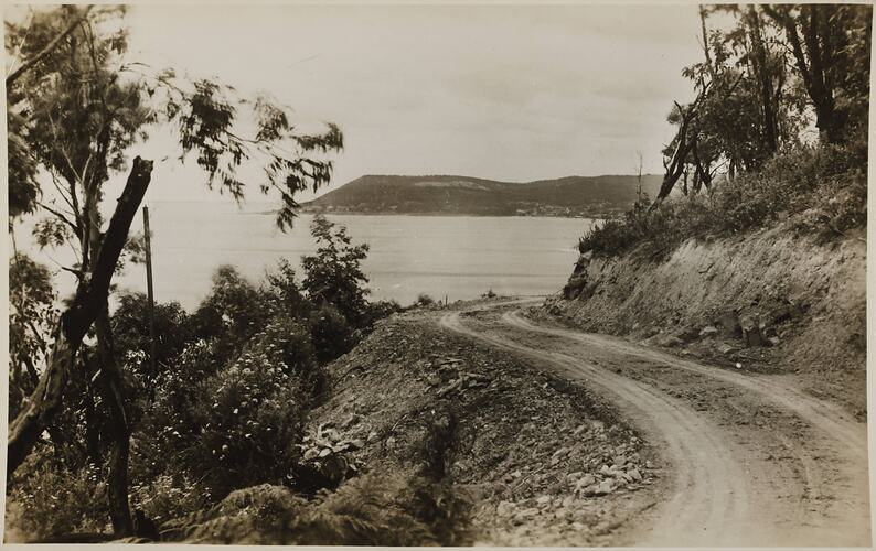 Black and white image of coastal road near Lorne, Victoria. It is part of a collection of glass plate negatives, stereoscopic negatives, panoramas, postcards, photographs and cameras belonging to the William S Anderson Collection.
