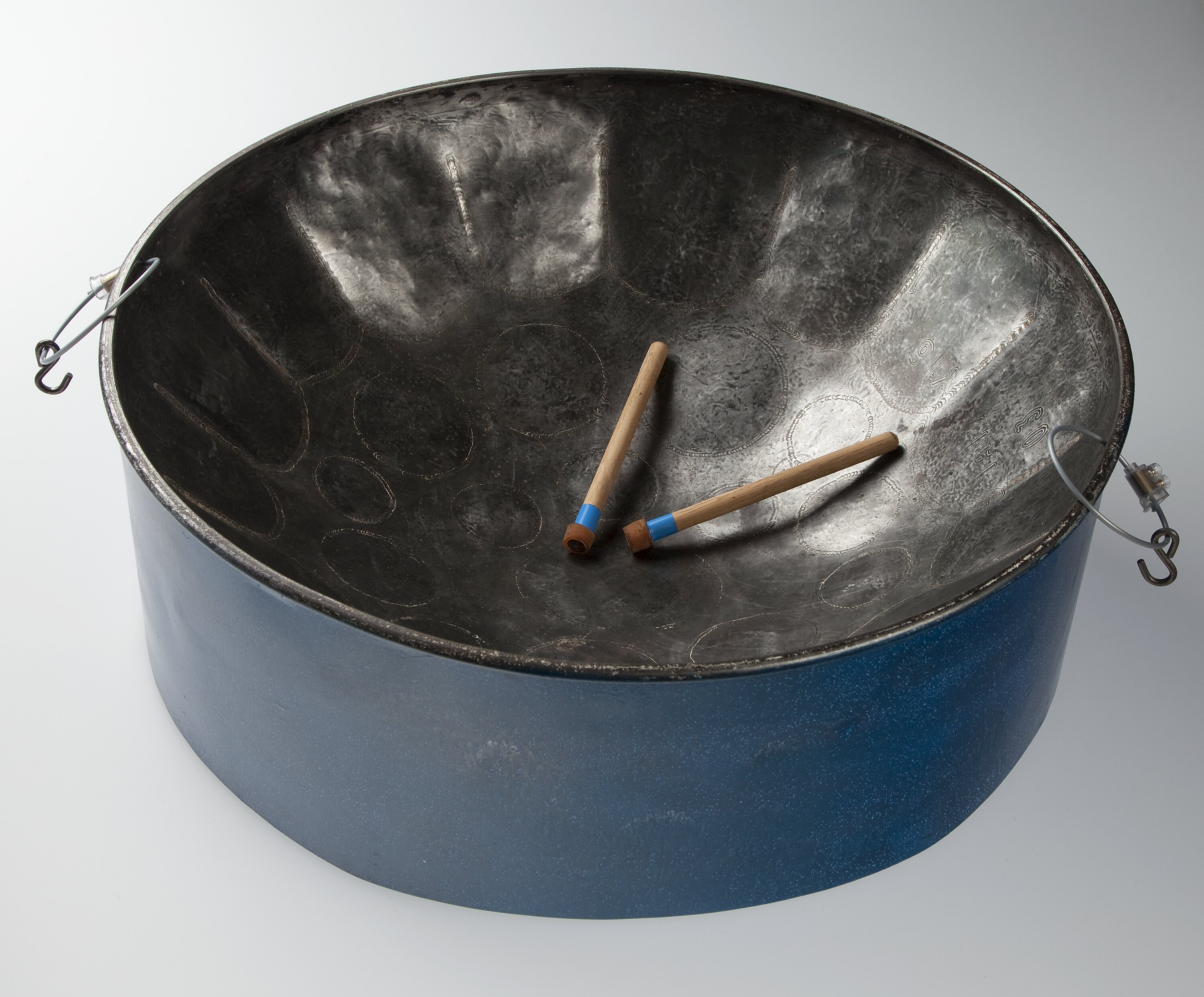 Ellie Mannette old fashioned 44 gallon tenor pan coloured blue on the outside with beaten circle and line patterns on the inside. Steelpan comes with two sticks and a stand.