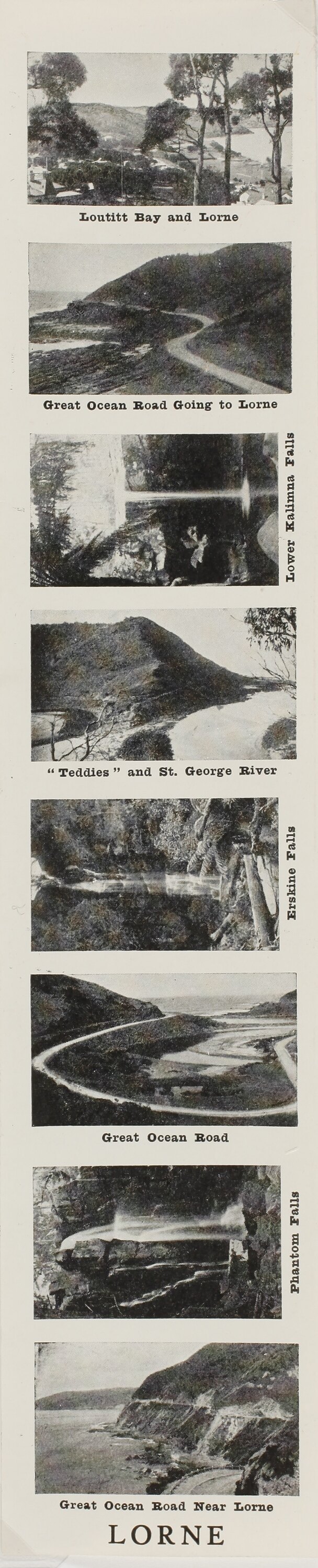 Printed in black text on front: 'Loutitt Bay and Lorne / Great Ocean Road Going to Lorne / Lower Kalimna Falls / "Teddies" and St. George River / Erskine Falls / Great Ocean Road / Phantom Falls / Great Ocean Road Near Lorne / LORNE'