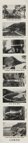 Set of eight black and white images of the Lorne District, with captions, on a tall, narrow, rectangular piece of paper like a bookmark. It is part of a collection of glass plate negatives, stereoscopic negatives, panoramas, postcards, photographs and cameras belonging to the William S Anderson Collection.