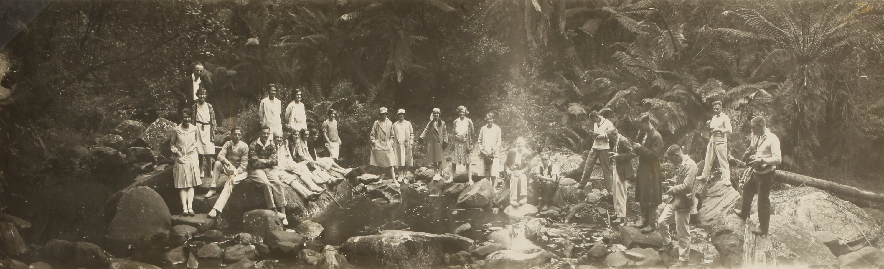 Black and white photograph of a group of men and women around a small pool in bushland. It is part of a collection of glass plate negatives, stereoscopic negatives, panoramas, postcards, photographs and cameras belonging to the William S Anderson Collection.