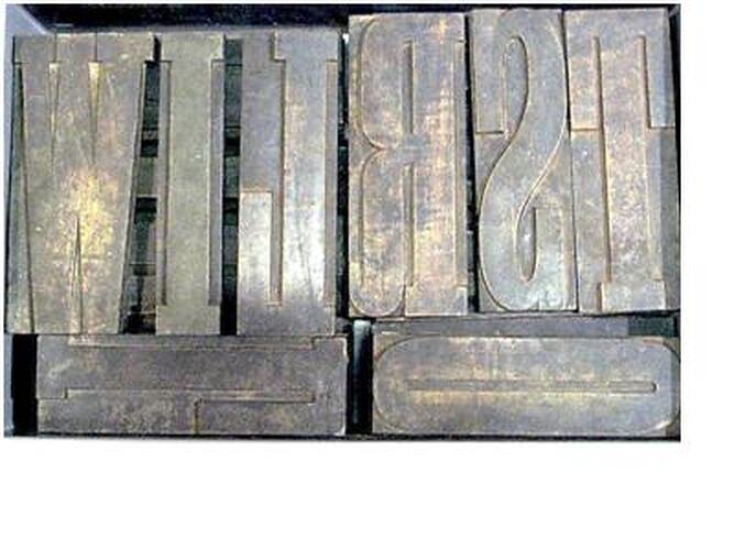Museum container (plastic tray) holding wooden printing type. One of eight trays containing large wooden type. The founts are valuable for size alone. Their date of manufacture is unknown and there is no identification on any piece of wood type.