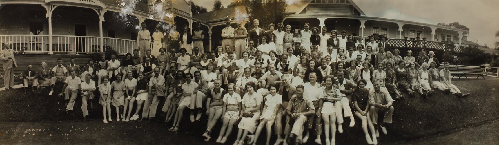 Group portrait of the guests from Carinya Guest House. Large group of men and women are pictured standing and sitting on the lawn outside the Guest House.