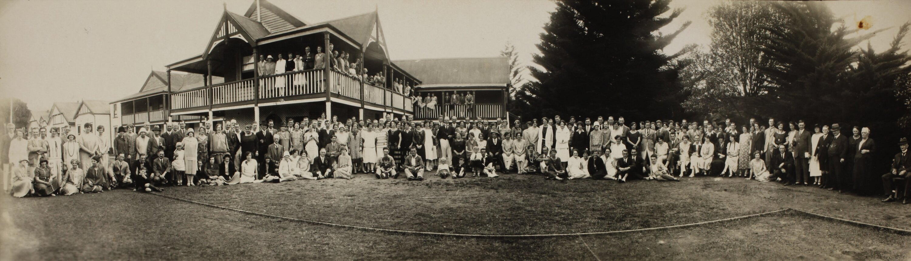 Group portrait of the guests from Carinya Guest House. Large group of men and women are pictured standing and sitting on the lawn and verandah outside the Guest House.