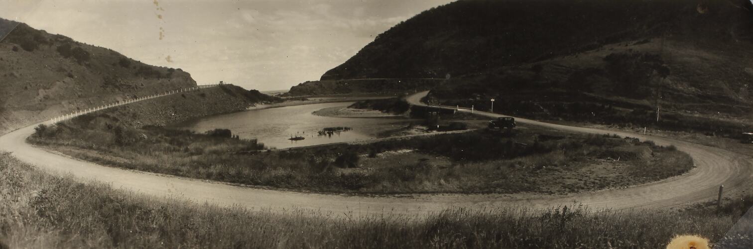 Black and white image depicting the mouth of the St George River, just south of the town of Lorne, with the Great Ocean Road winding around and over it. It is part of a collection of glass plate negatives, stereoscopic negatives, panoramas, postcards, photographs and cameras belonging to the William S Anderson Collection.
