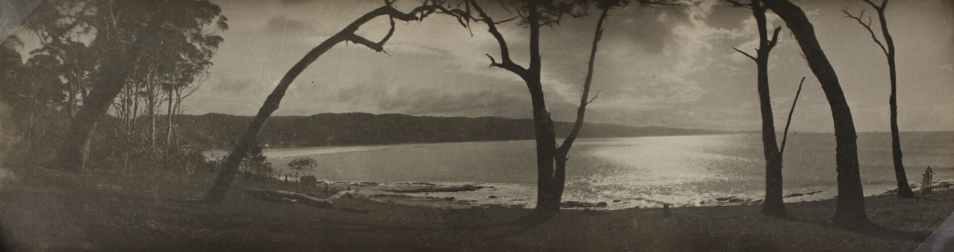 Monochrome photograph of Loutit Bay, Lorne, seen through the gum trees. It is part of a collection of glass plate negatives, stereoscopic negatives, panoramas, postcards, photographs and cameras belonging to the William S Anderson Collection.