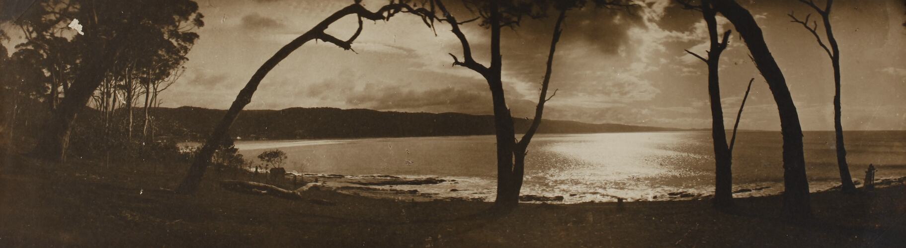 Monochrome photograph of Loutit Bay, Lorne, seen through the gum trees. It is part of a collection of glass plate negatives, stereoscopic negatives, panoramas, postcards, photographs and cameras belonging to the William S Anderson Collection.
