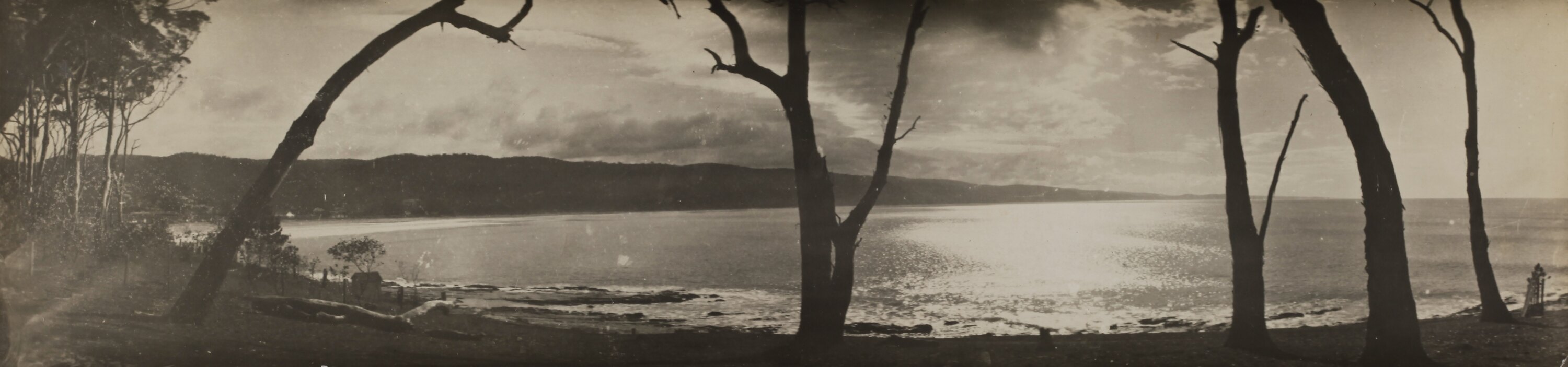 Monochrome photograph of Loutit Bay, Lorne, through the gum trees. It is part of a collection of glass plate negatives, stereoscopic negatives, panoramas, postcards, photographs and cameras belonging to the William S Anderson Collection.
