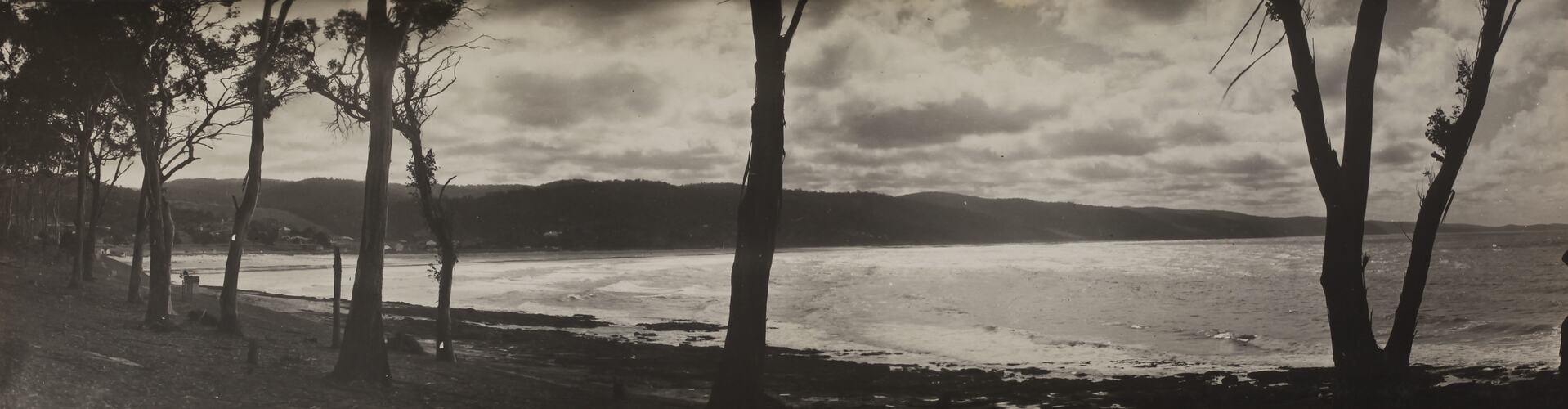 Monochrome photograph of Loutit Bay, Lorne, through the gum trees. It is part of a collection of glass plate negatives, stereoscopic negatives, panoramas, postcards, photographs and cameras belonging to the William S Anderson Collection.