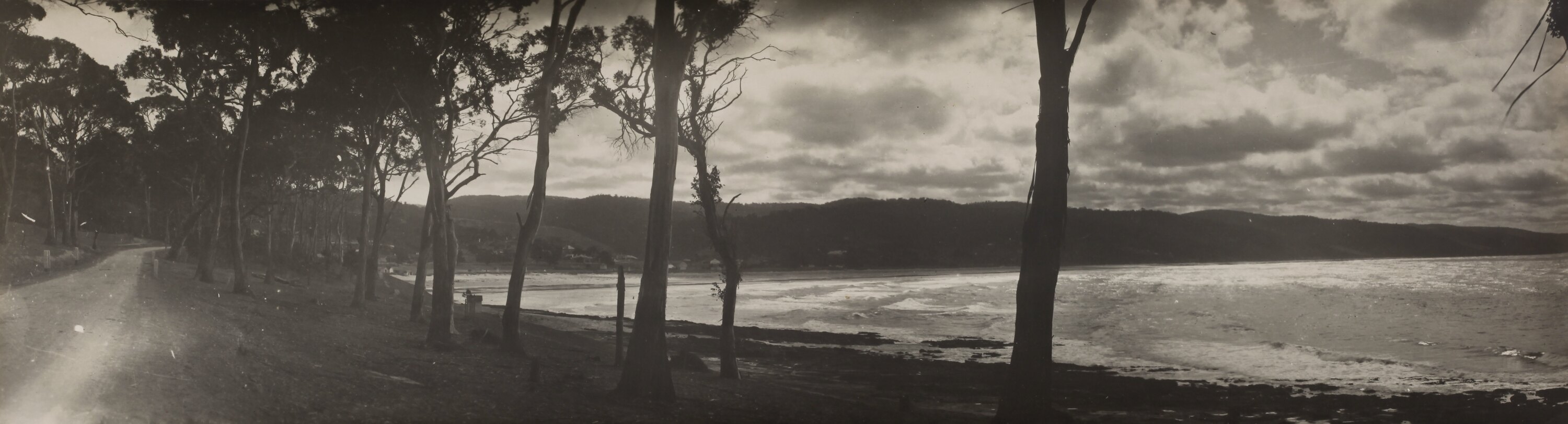 Monochrome photograph of Loutit Bay, Lorne, through the gum trees. It is part of a collection of glass plate negatives, stereoscopic negatives, panoramas, postcards, photographs and cameras belonging to the William S Anderson Collection.