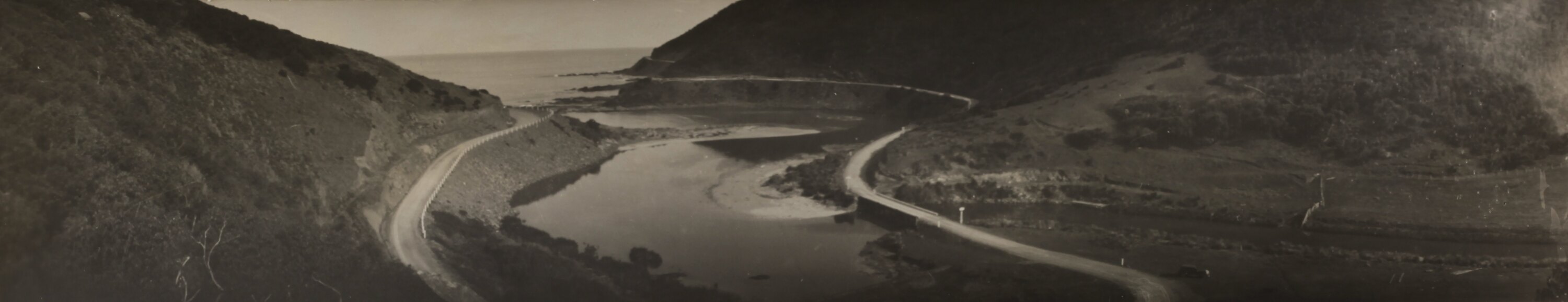 Black and white image depicting the mouth of the St George River, just south of the town of Lorne, with the Great Ocean Road winding around and over it. It is part of a collection of glass plate negatives, stereoscopic negatives, panoramas, postcards, photographs and cameras belonging to the William S Anderson Collection.