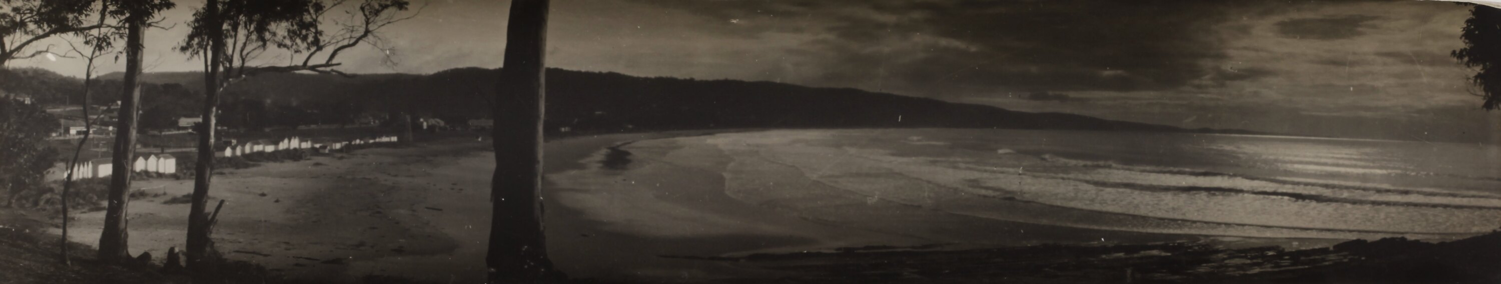 Monochrome photograph of Loutit Bay, Lorne seen through the gum trees. It is part of a collection of glass plate negatives, stereoscopic negatives, panoramas, postcards, photographs and cameras belonging to the William S Anderson Collection.