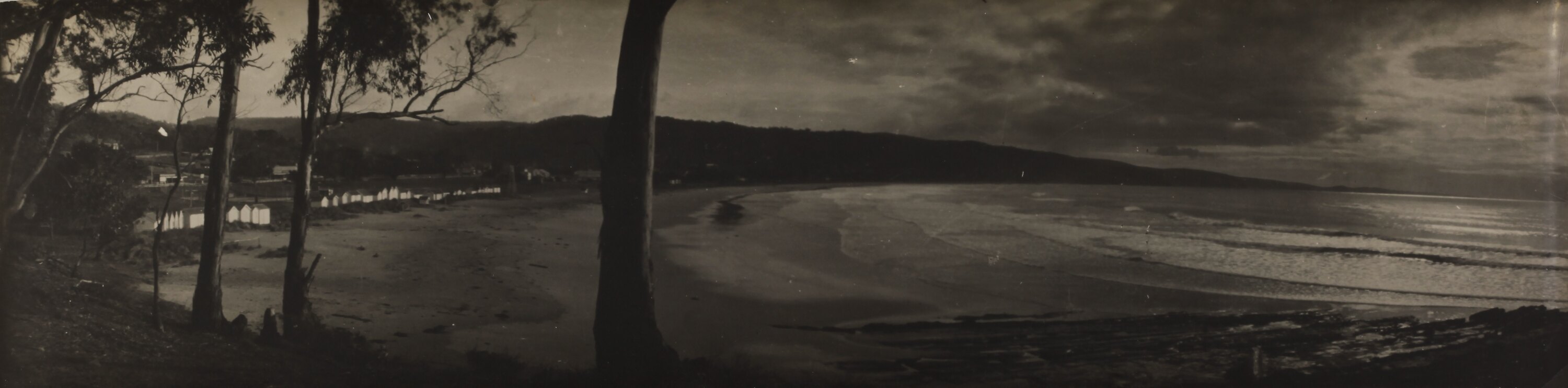 Monochrome photograph of Loutit Bay, Lorne seen through the gum trees. It is part of a collection of glass plate negatives, stereoscopic negatives, panoramas, postcards, photographs and cameras belonging to the William S Anderson Collection.