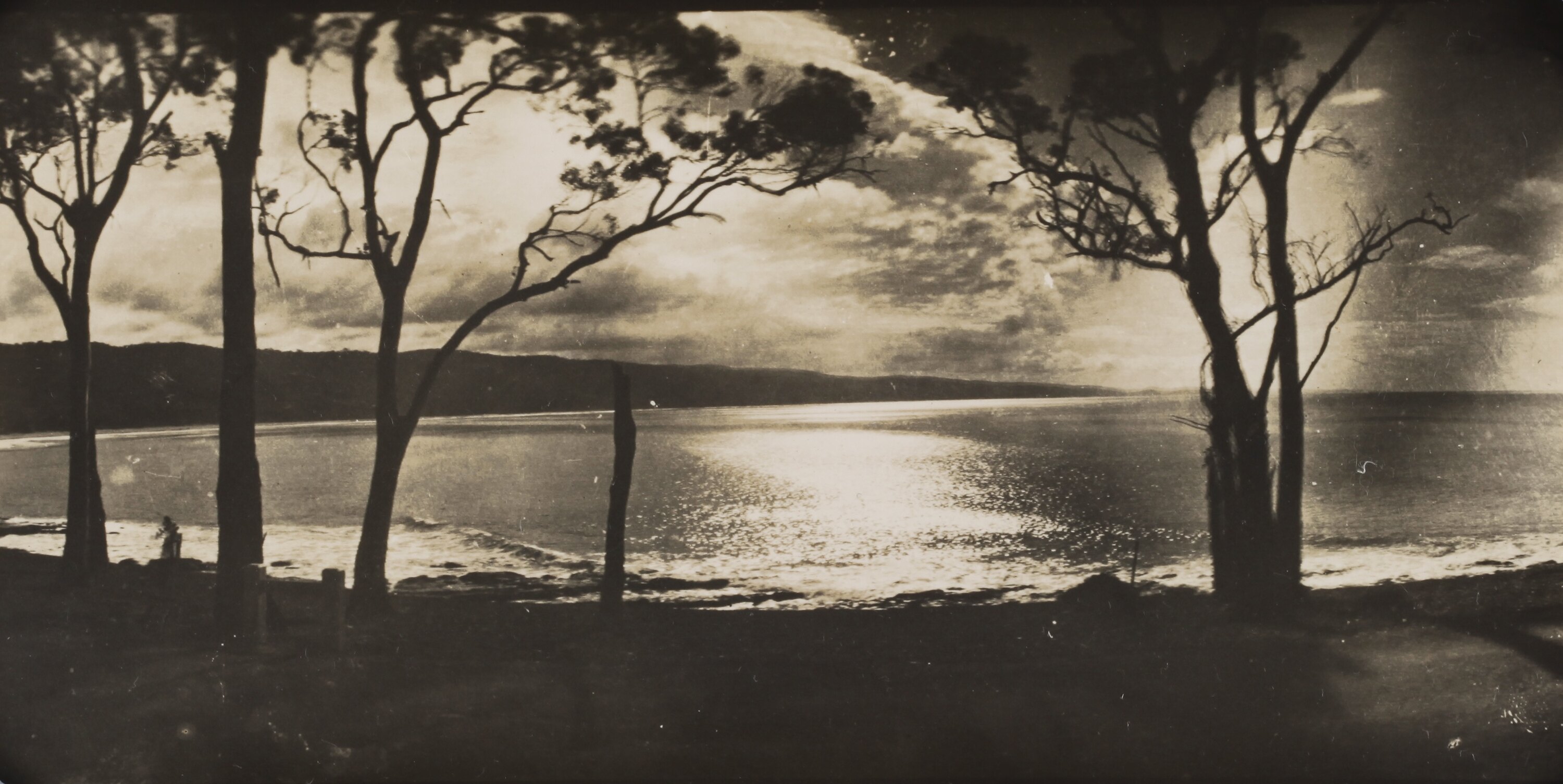 Monochrome photograph of a moonlit Loutit Bay, Lorne. It is part of a collection of glass plate negatives, stereoscopic negatives, panoramas, postcards, photographs and cameras belonging to the William S Anderson Collection.