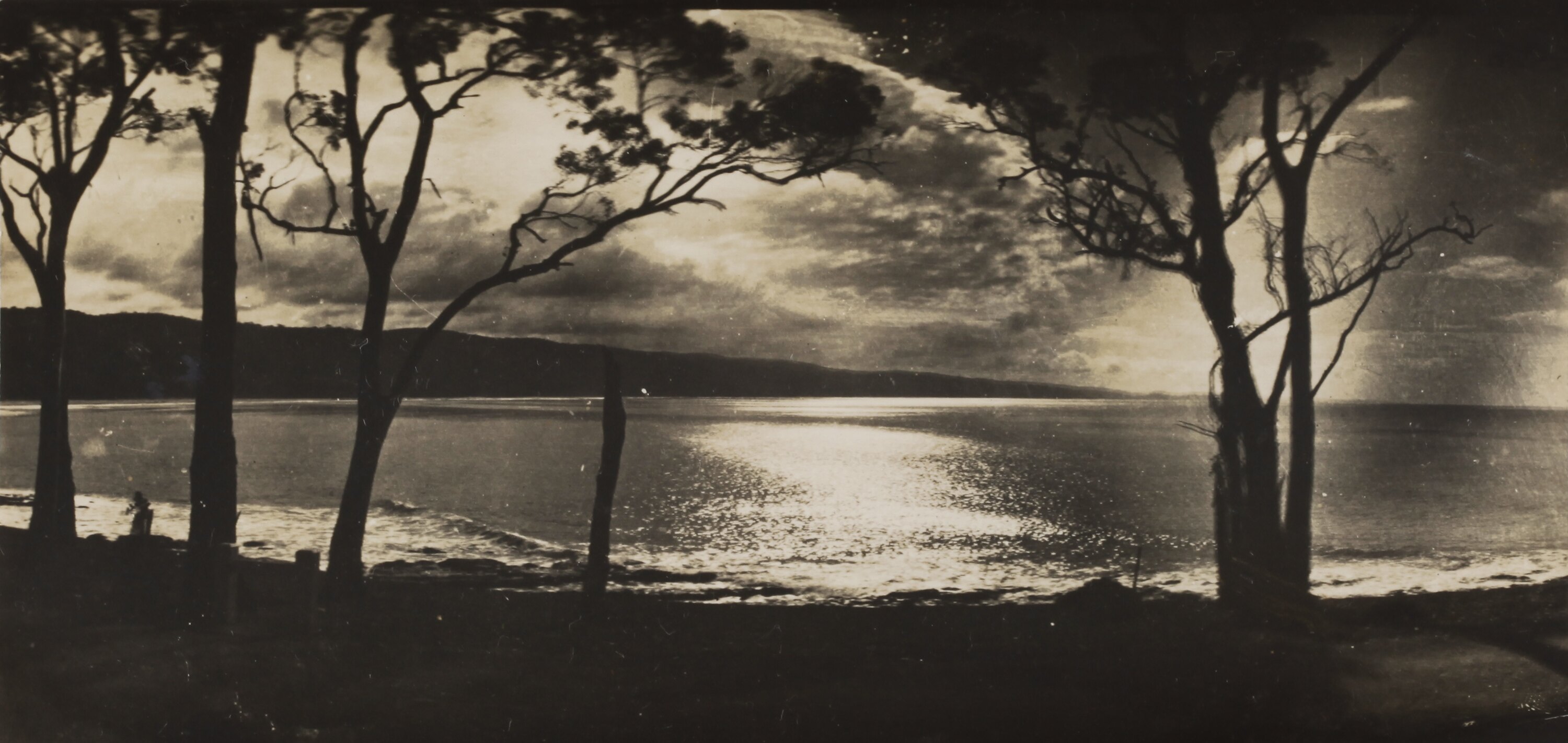 Monochrome photograph of a moonlit Loutit Bay, Lorne. It is part of a collection of glass plate negatives, stereoscopic negatives, panoramas, postcards, photographs and cameras belonging to the William S Anderson Collection.