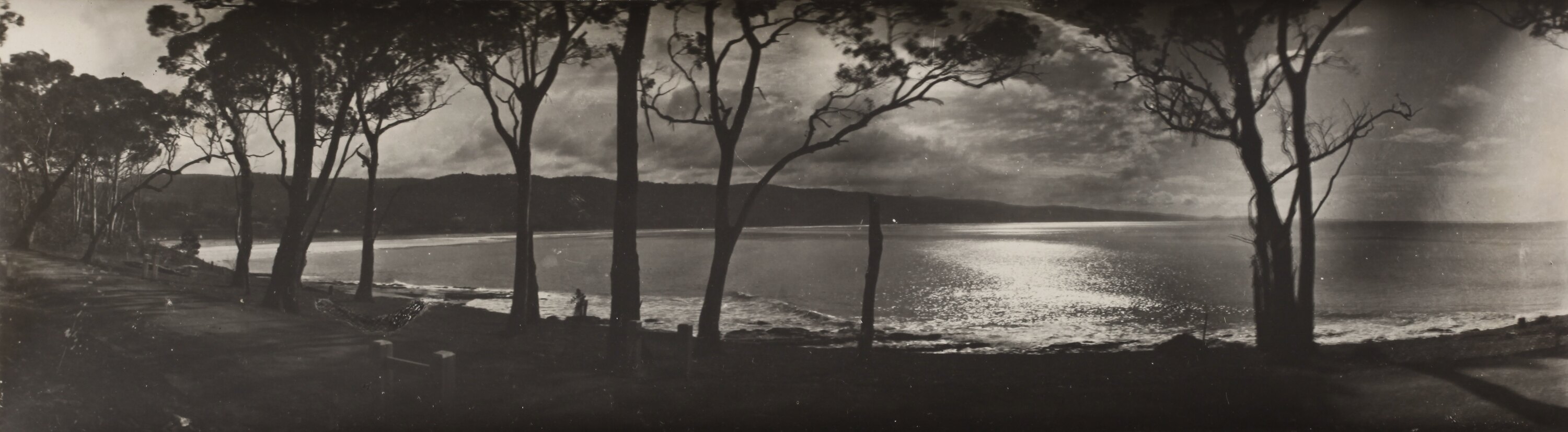 Monochrome photograph of a moonlit Loutit Bay, Lorne. It is part of a collection of glass plate negatives, stereoscopic negatives, panoramas, postcards, photographs and cameras belonging to the William S Anderson Collection.