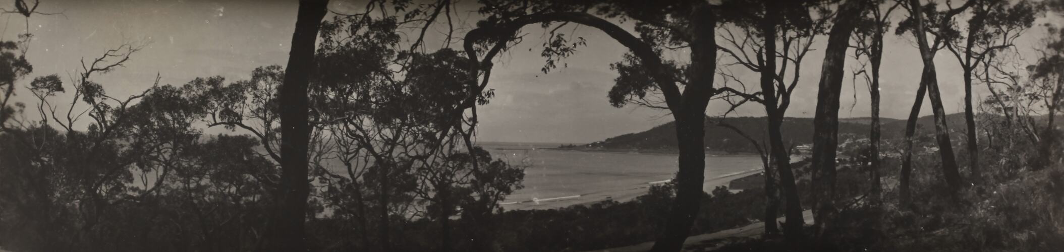 Monochrome photograph of Loutit Bay, Lorne, seen through the gum trees, looking towards the point. It is part of a collection of glass plate negatives, stereoscopic negatives, panoramas, postcards, photographs and cameras belonging to the William S Anderson Collection.