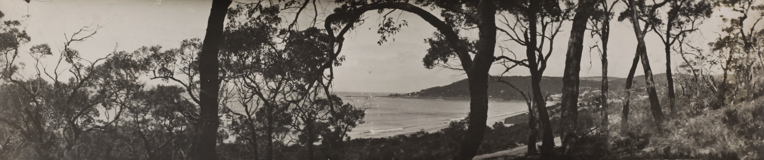 Monochrome photograph of Loutit Bay, Lorne, seen through the gum trees, looking towards the point. It is part of a collection of glass plate negatives, stereoscopic negatives, panoramas, postcards, photographs and cameras belonging to the William S Anderson Collection.