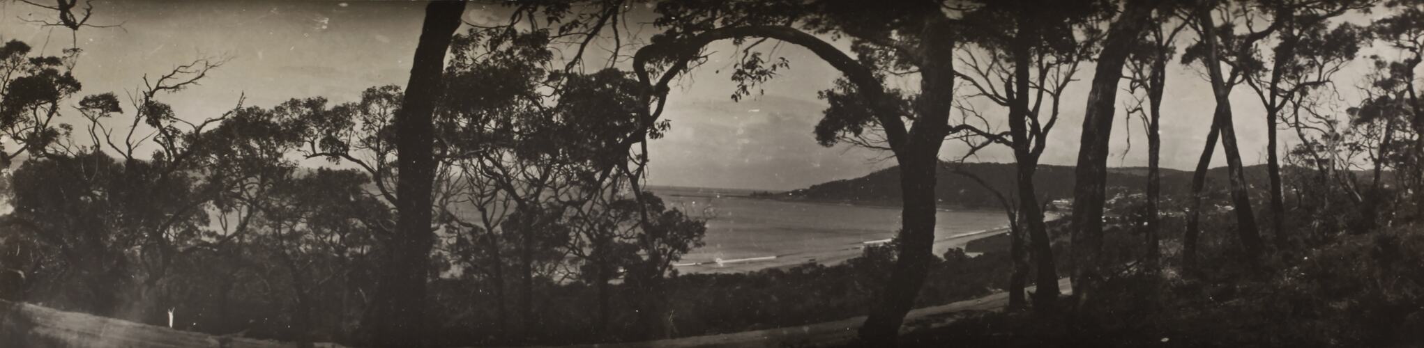 Monochrome photograph of Loutit Bay, Lorne, seen through the gum trees, looking towards the point. It is part of a collection of glass plate negatives, stereoscopic negatives, panoramas, postcards, photographs and cameras belonging to the William S Anderson Collection.