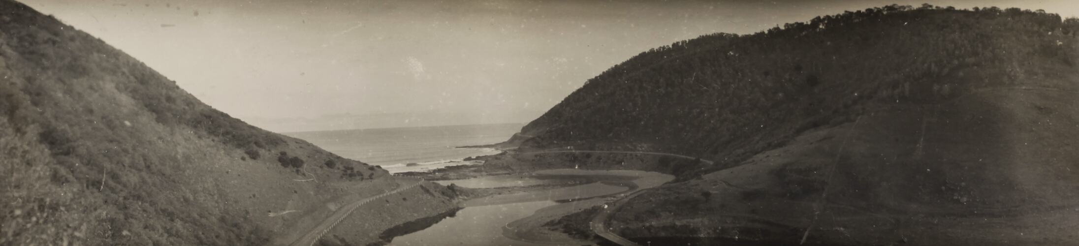 Black and white photograph of the mouth of the St George River, just south of Lorne, with the Great Ocean Road winding around it. It is part of a collection of glass plate negatives, stereoscopic negatives, panoramas, postcards, photographs and cameras belonging to the William S Anderson Collection.