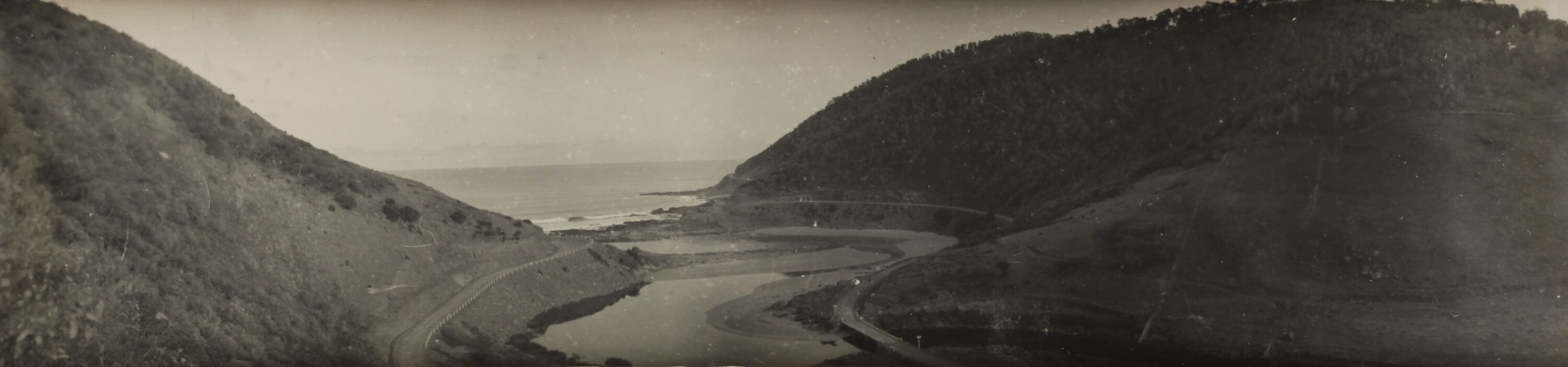 Black and white photograph of the mouth of the St George River, just south of Lorne, with the Great Ocean Road winding around it. It is part of a collection of glass plate negatives, stereoscopic negatives, panoramas, postcards, photographs and cameras belonging to the William S Anderson Collection.