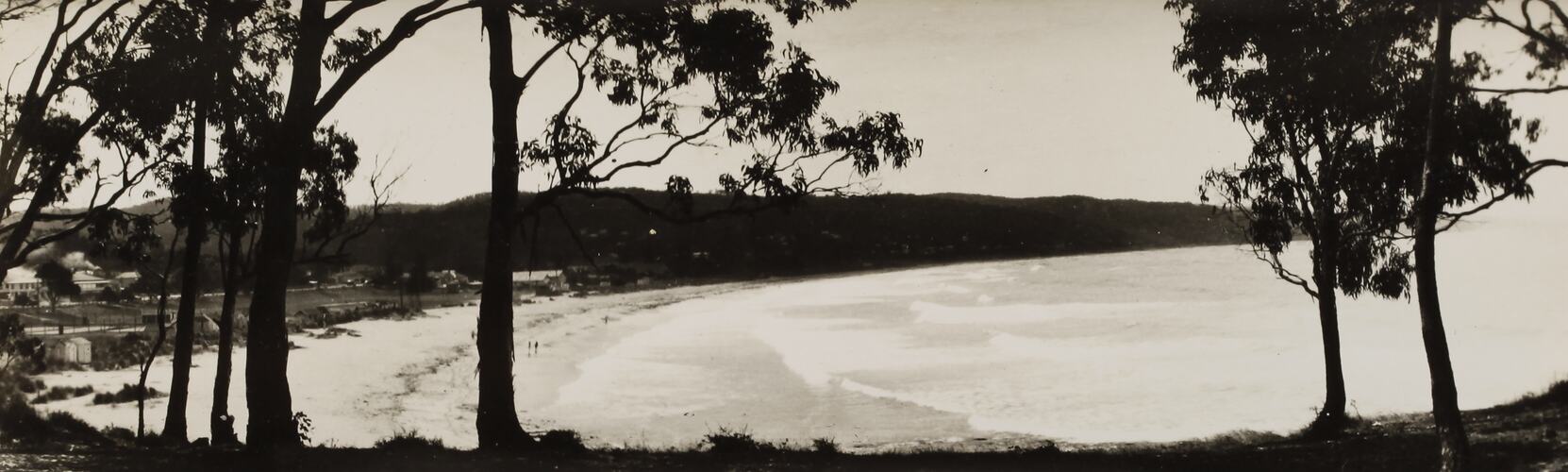 Monochrome photograph of Loutit Bay, Lorne, seen through the gum trees. It is part of a collection of glass plate negatives, stereoscopic negatives, panoramas, postcards, photographs and cameras belonging to the William S Anderson Collection.