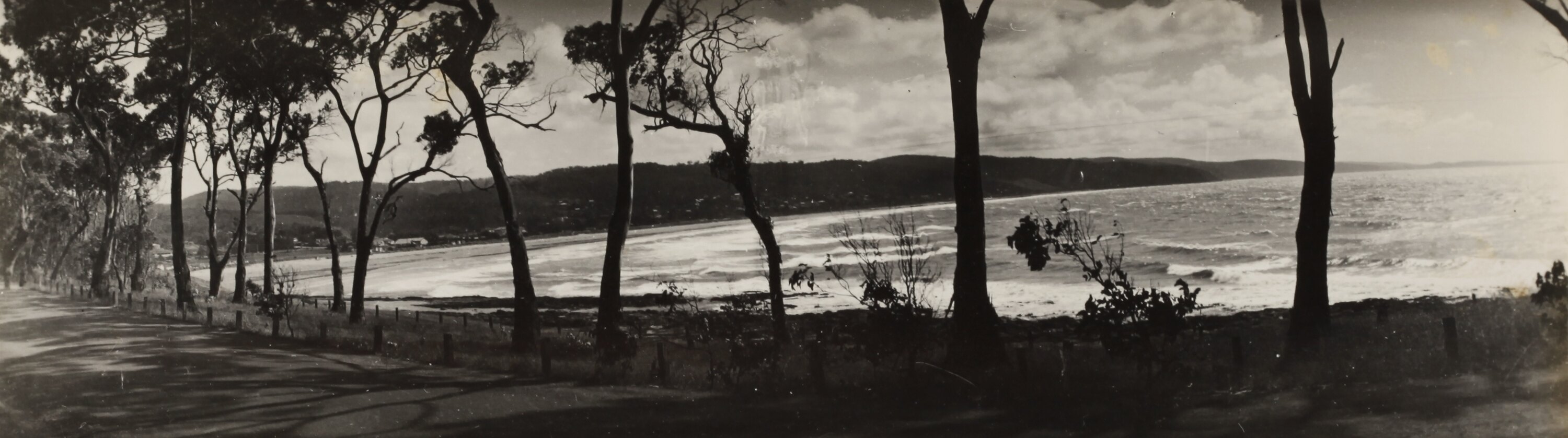 Monochrome photograph of Loutit Bay, Lorne, seen through the gum trees. It is part of a collection of glass plate negatives, stereoscopic negatives, panoramas, postcards, photographs and cameras belonging to the William S Anderson Collection.