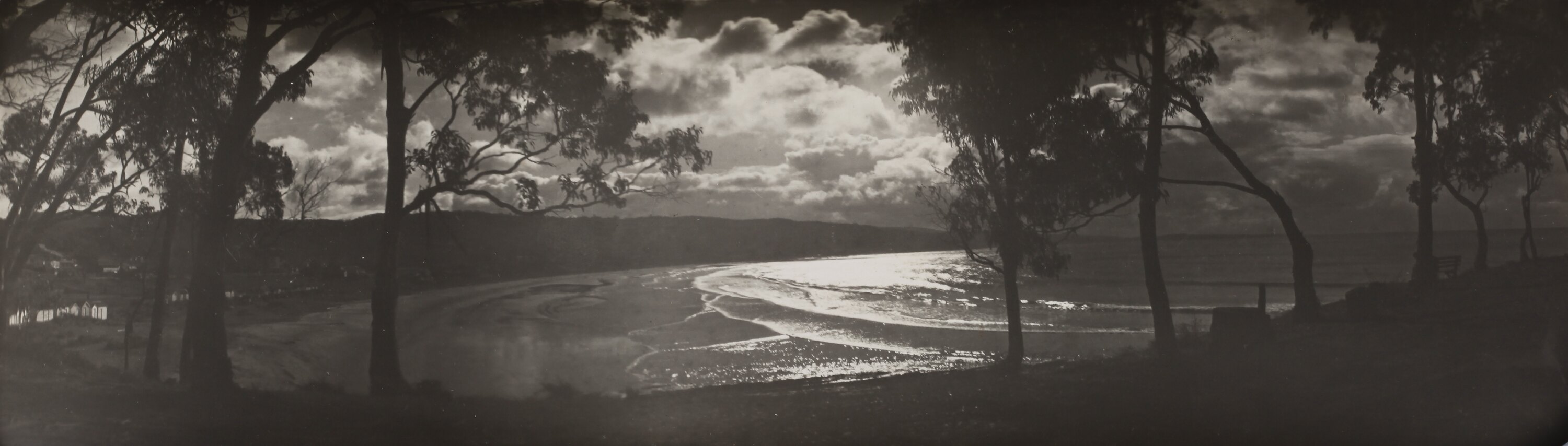 Monochrome photograph of Loutit Bay, Lorne seen through the gum trees. It is part of a collection of glass plate negatives, stereoscopic negatives, panoramas, postcards, photographs and cameras belonging to the William S Anderson Collection.