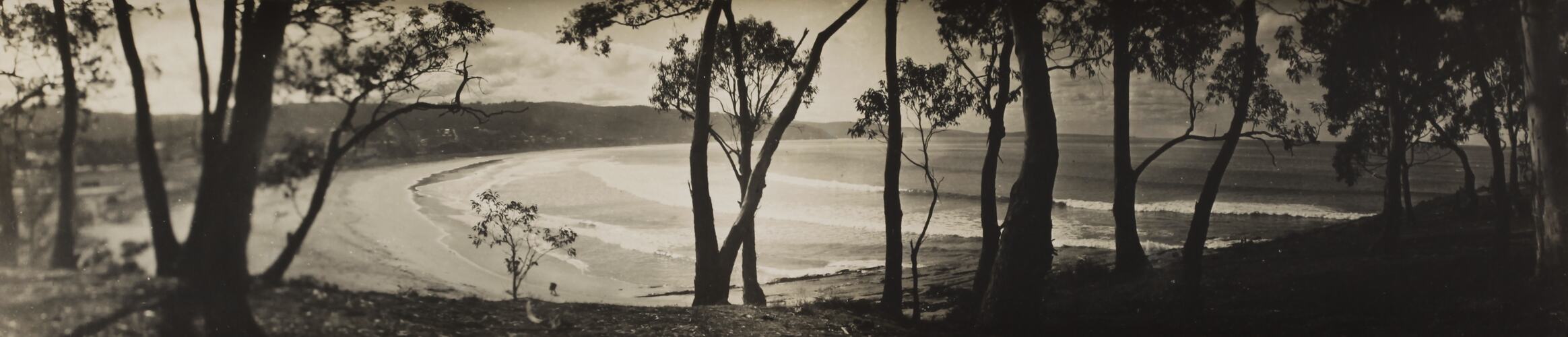 Monochrome photograph of Loutit Bay, Lorne seen through the gum trees. It is part of a collection of glass plate negatives, stereoscopic negatives, panoramas, postcards, photographs and cameras belonging to the William S Anderson Collection.