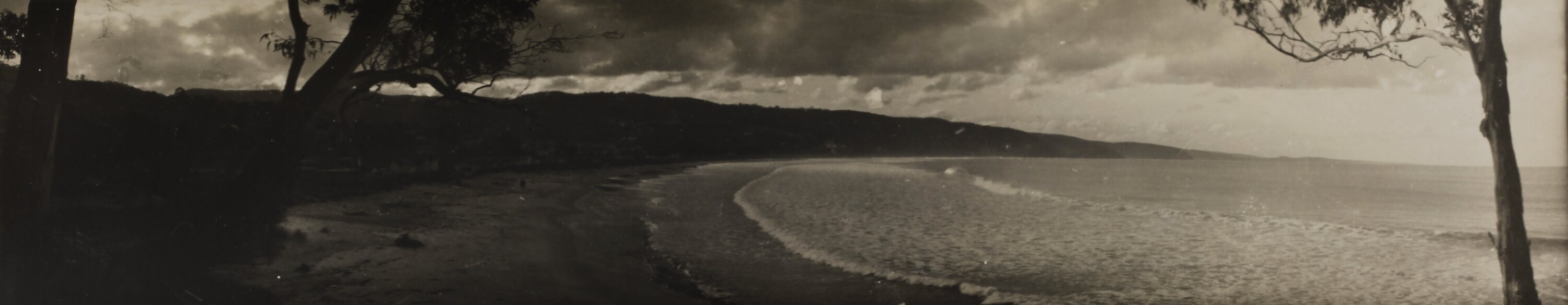 Monochrome photograph of Loutit Bay, Lorne seen through the gum trees. It is part of a collection of glass plate negatives, stereoscopic negatives, panoramas, postcards, photographs and cameras belonging to the William S Anderson Collection.