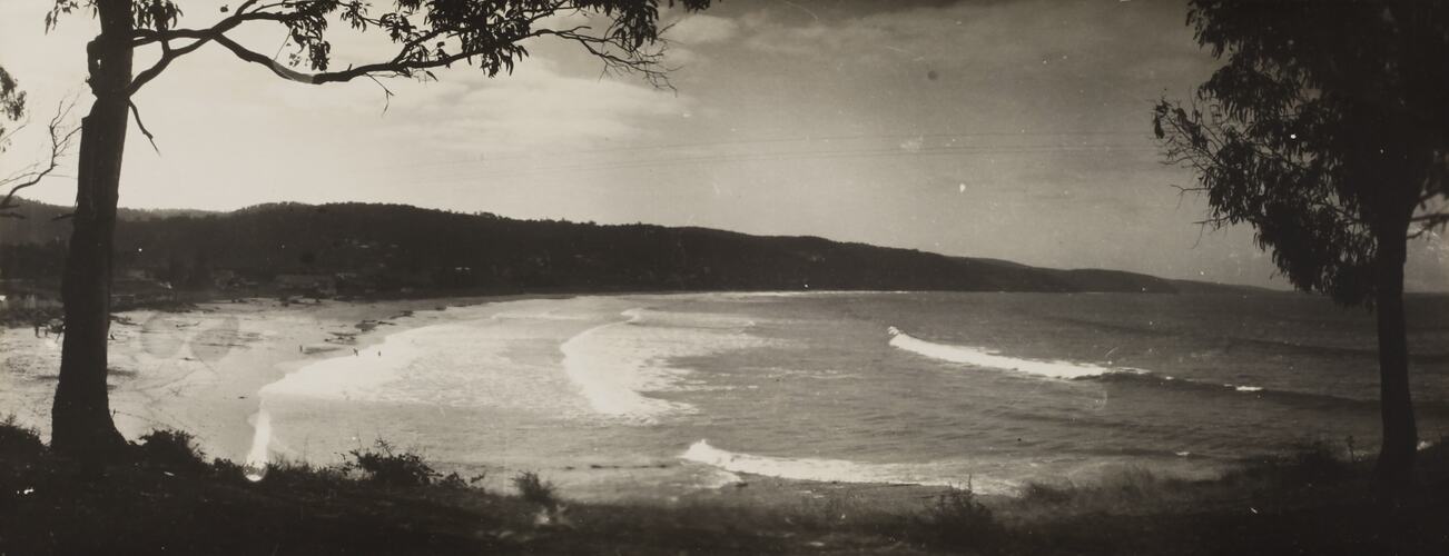 Monochrome photograph of Loutit Bay, Lorne seen through the gum trees. It is part of a collection of glass plate negatives, stereoscopic negatives, panoramas, postcards, photographs and cameras belonging to the William S Anderson Collection.