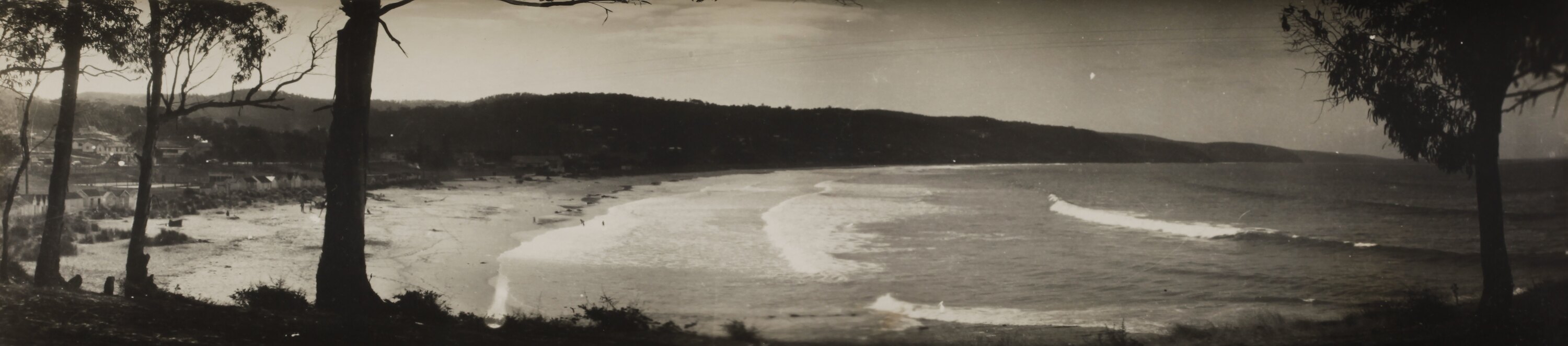Monochrome photograph of Loutit Bay, Lorne seen through the gum trees. It is part of a collection of glass plate negatives, stereoscopic negatives, panoramas, postcards, photographs and cameras belonging to the William S Anderson Collection.