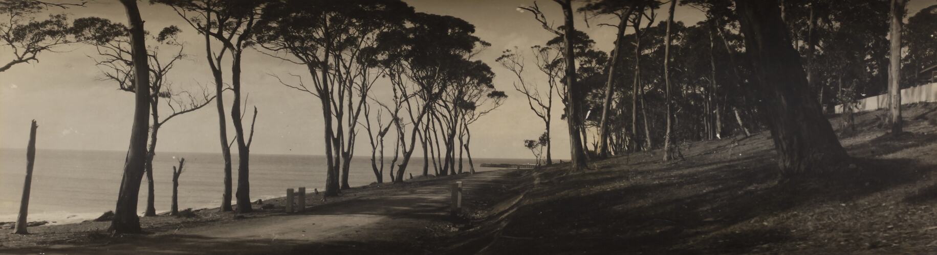 Monochrome photograph of Loutit Bay, Lorne, seen through the gum trees, looking towards the Pier. It is part of a collection of glass plate negatives, stereoscopic negatives, panoramas, postcards, photographs and cameras belonging to the William S Anderson Collection.