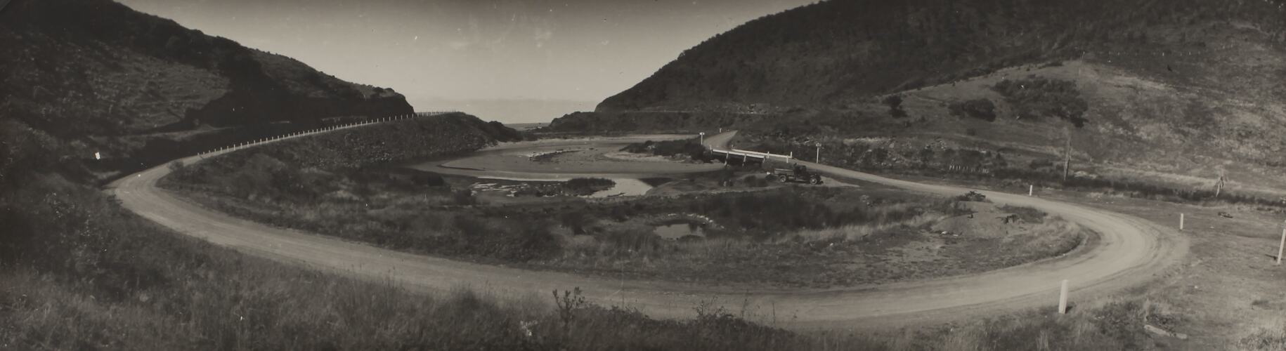 Black and white image depicting the mouth of the St George River, just south of the town of Lorne, with the Great Ocean Road winding around and over it. It is part of a collection of glass plate negatives, stereoscopic negatives, panoramas, postcards, photographs and cameras belonging to the William S Anderson Collection.