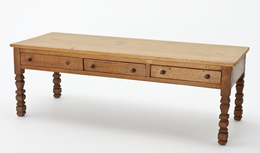 Wooden rectangular table with turned legs and three drawers.