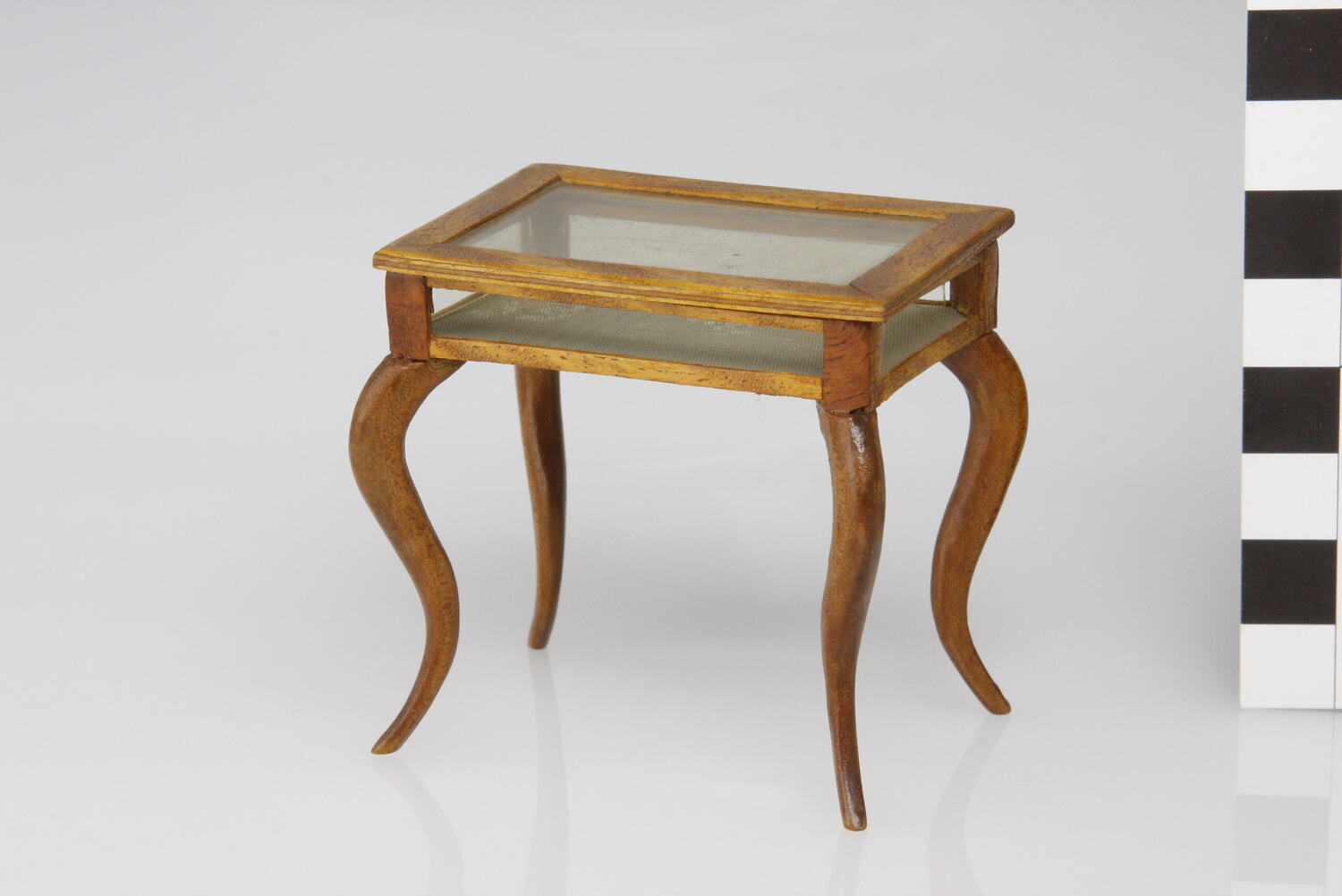 Rectangular display table. Hinged glass top and four sides. Bow legs under table. Silk lining inside of table.