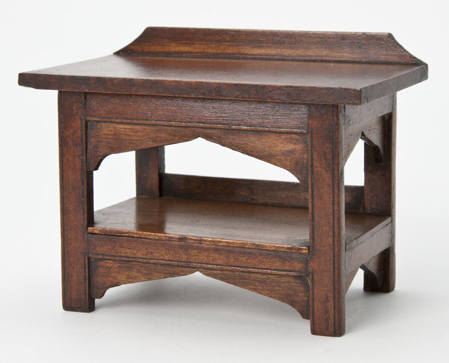 Rectangular wooden desk, stained dark brown. Small border of wood across the back of the desk top. Desk has four legs and a bottom shelf. Scalloped decorative spandrils between the table legs, and across the base of the bottom shelf.