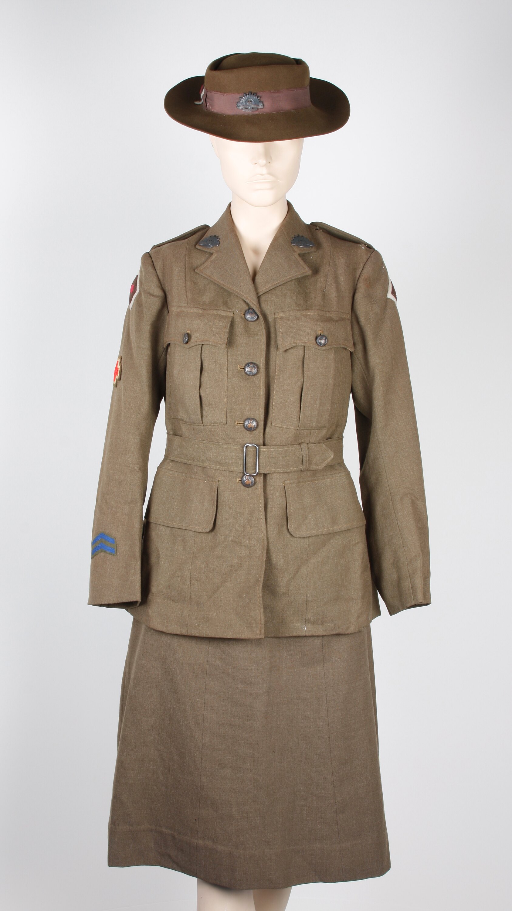Khaki uniform comprising jacket and skirt. Khaki wool jacket, secured with four brass badges down front and waist belt with plain steel buckle. Buttons have raised outline of Australia, crown above, and inscription 'AUSTRALIAN MILITARY FORCES'. Pocket on each breast, with flap secured by smaller version of same button; pocket on each hip, with flaps but without buttons. Rising sun badge on each side of collar. On each shoulder is sewn a felt patch, comprising white diamond, topped with brown diamond, and finally finished with maroon rectangle - a unit colour patch. Beneath this, on the right arm, is a red cross, satin stitched in red and white on khaki felt. On right sleeve is a pair of blue chevrons on a single patch. Shoulders each have an epaulette, secured with a further button, and a badge 'AUSTRALIA. Cream lining, stained, particularly around back opening. Moth holes throughout. Khaki wool skirt, A-line, with 40mm wide waist band, tightened with two steel buckles. Right side opening, fastened with four hooks and eyes. Pair of slit pockets on back. Unlined. Cream label inside back of waist band.