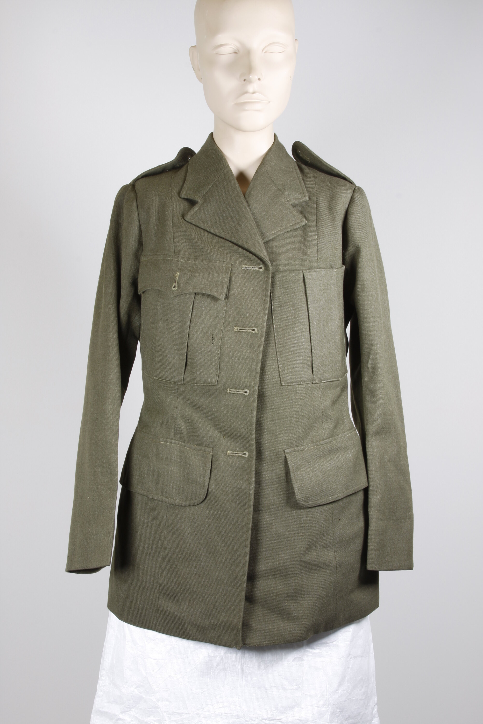 Khaki wool jacket, with four button holes down front (missing buttons), with separate waist belt with plain steel buckle. Pocket on each breast, with flap (buttons missing); pocket on each hip, with flaps but without button holes. Badges on collar missing (evidence of where they would have been attached). Shoulders each have an epaulette, again with button missing. Lined with khaki fabric. Cream label at neck. Moth holes throughout.