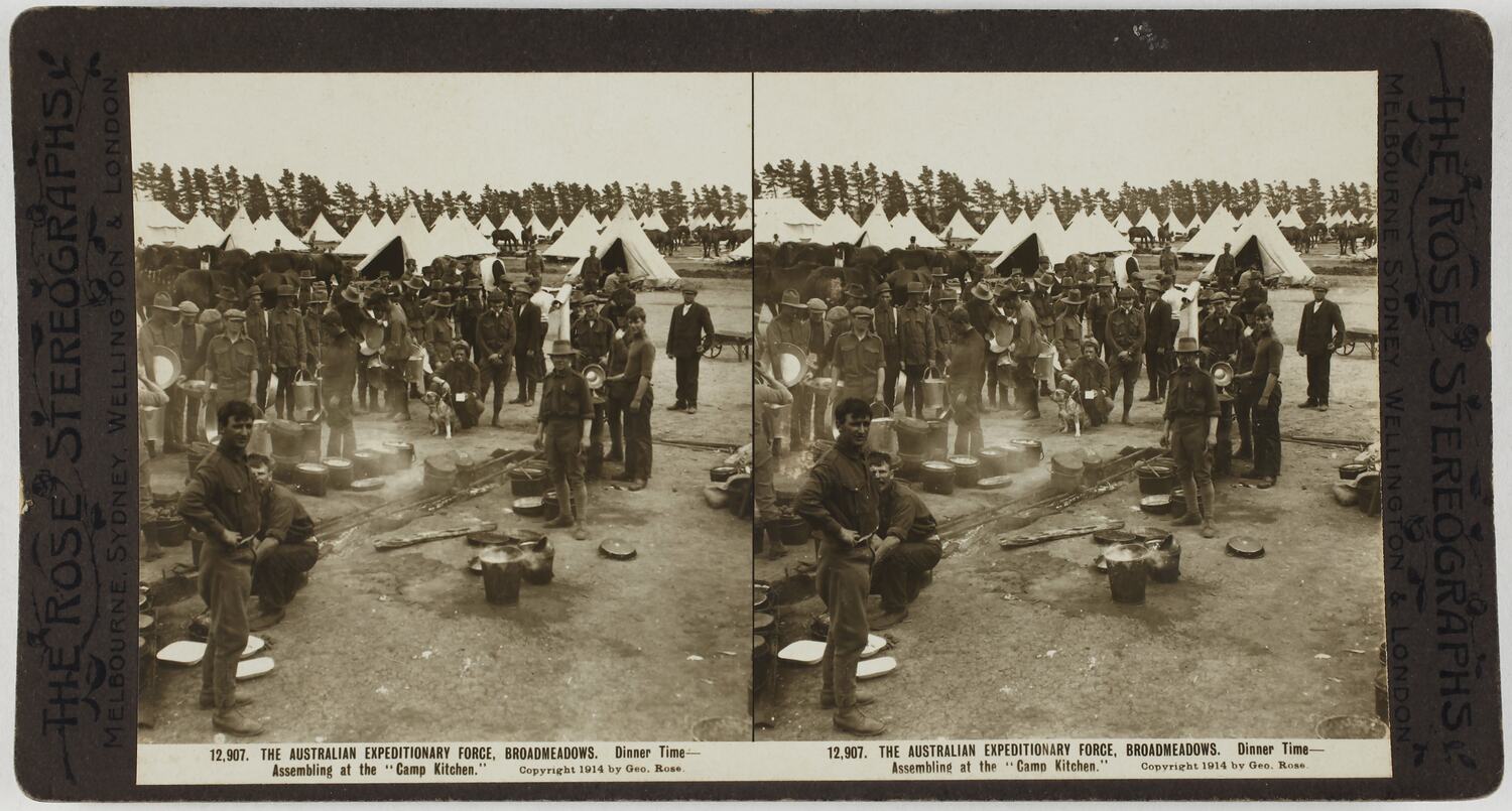 Printed in brown text on front of stereograph: 'THE ROSE STEREOGRAPHS / MELBOURNE, SYDNEY, WELLINGTON & LONDON / THE ROSE STEREOGRAPHS / MELBOURNE, SYDNEY, WELLINGTON & LONDON / 12,907. THE AUSTRALIAN FORCE , BROADMEADOWS. Dinner Time - / Assembling at the "Camp Kitchen." Copyright 1914 by Geo. Rose. / 12,907. THE AUSTRALIAN FORCE , BROADMEADOWS. Dinner Time - / Assembling at the "Camp Kitchen." Copyright 1914 by Geo. Rose.' Hand written in grey pencil on back of stereograph: 'ST 1367'
