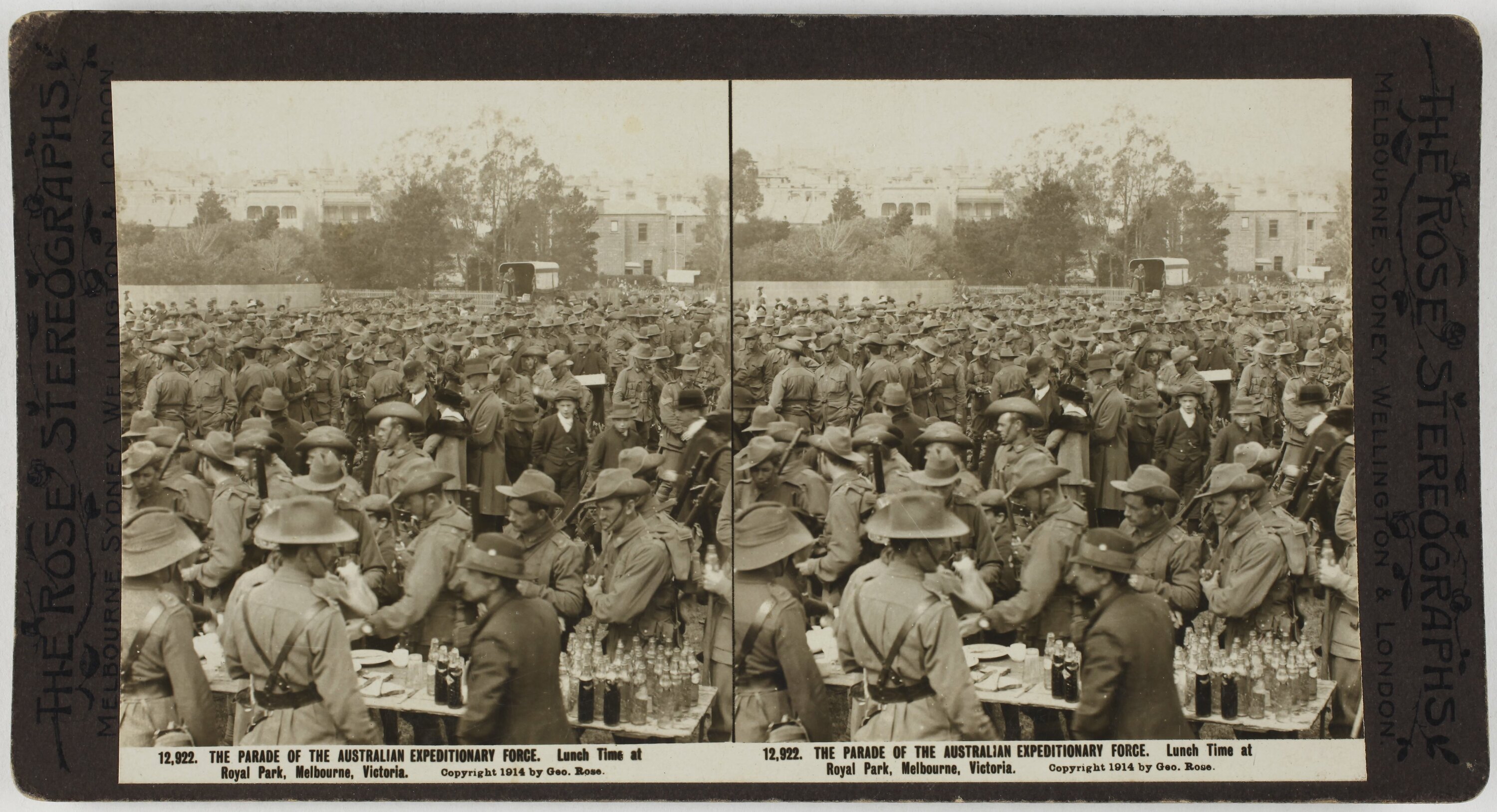 Printed in brown text on front of stereograph: 'THE ROSE STEREOGRAPHS / MELBOURNE, SYDNEY, WELLINGTON & LONDON / THE ROSE STEREOGRAPHS / MELBOURNE, SYDNEY, WELLINGTON & LONDON / 12,922. THE PARADE OF THE AUSTRALIAN EXPEDITIONARY FORCE. Lunch Time at / Royal Park, Melbourne, Victoria. Copyright 1914 by Geo. Rose. / 12,922. THE PARADE OF THE AUSTRALIAN EXPEDITIONARY FORCE. Lunch Time at / Royal Park, Melbourne, Victoria. Copyright 1914 by Geo. Rose.' Hand written in grey pencil on back of stereograph: 'ST 1374'