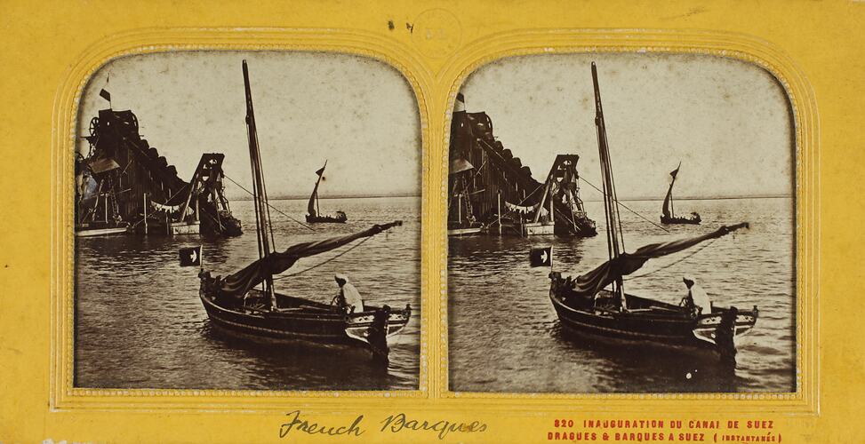 Stereograph depicting French Barques on the Suez Canal, circa 1865. The image was taken to commemorate the inauguration of the Suez Canal.