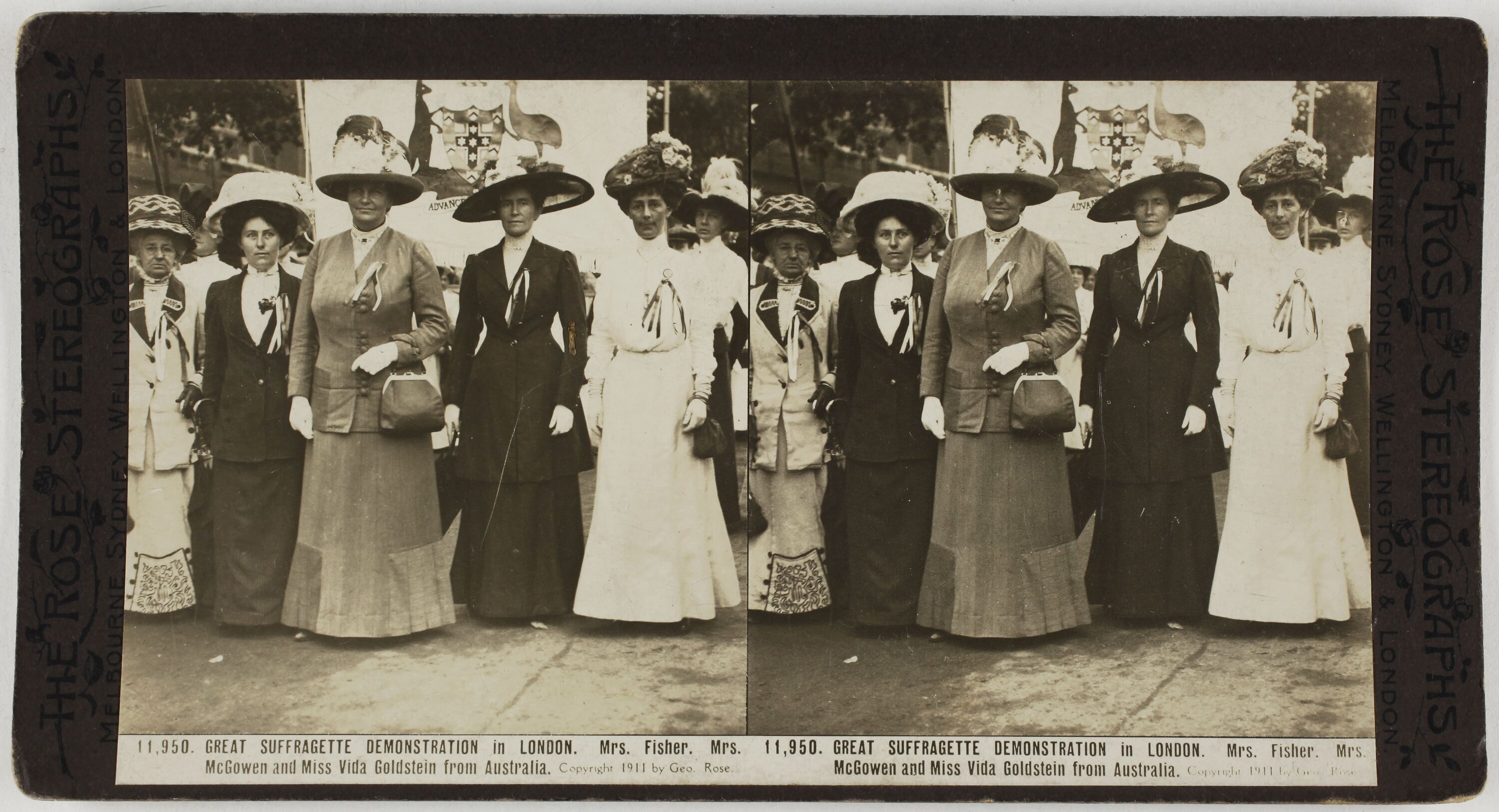 Stereograph depicting the Great Suffragette Demonstration in London, England, circa 1910. It was published by the Rose Stereograph company in 1911. The image shows Vida Goldstein who was brought over for the demonstration by the Women's Social and Political Union and introduced as "one of the foremost leaders of the Australian women's movement, ... now helping her sisters in England to win their freedom".