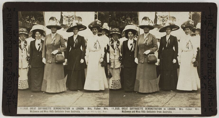 Printed in black ink on card: 'THE ROSE STEREOGRAPHS / MELBOURNE, SYDNEY, WELLINGTON & LONDON. / THE ROSE STEREOGRAPHS / MELBOURNE, SYDNEY, WELLINGTON & LONDON.' Printed in black ink on photograph: '11,950. GREAT SUFFRAGETTE DEMONSTRATION in LONDON. Mrs Fisher. Mrs. / McGowen and Miss Vida Goldstein from Australia. Copyright 1911 by Geo. Rose. / 11,950. GREAT SUFFRAGETTE DEMONSTRATION in LONDON. Mrs Fisher. Mrs. / McGowen and Miss Vida Goldstein from Australia. Copyright 1911 by Geo. Rose.' Handwritten in grey pencil on the back of card: '1454' Handwritten in black ink on the back of card: '310'