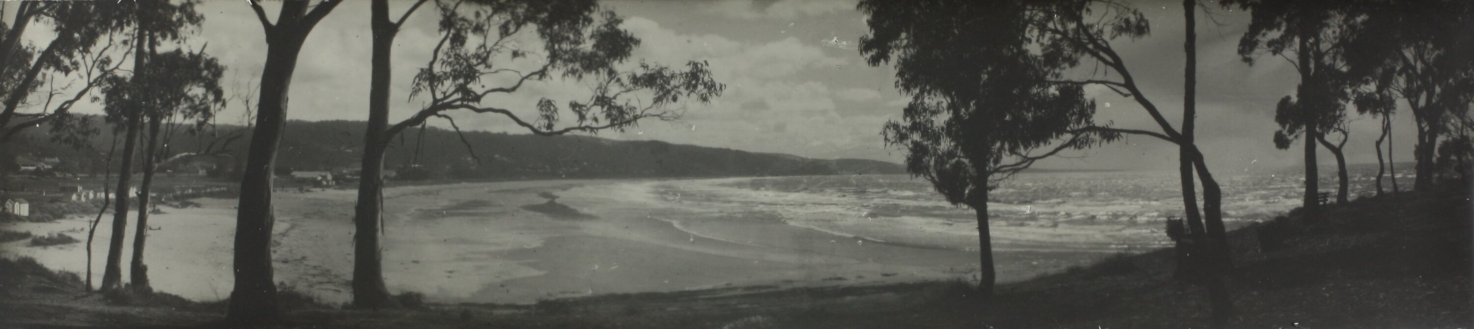 Monochrome photograph of Loutit Bay, Lorne seen through the gum trees. It is part of a collection of glass plate negatives, stereoscopic negatives, panoramas, postcards, photographs and cameras belonging to the William S Anderson Collection.