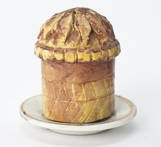 Tall decorated pie on a plate from Room 6 - Kitchen, Basement Central Section, Pendle Hall. From right side of central kitchen table. The plate is a ready made dolls plate.