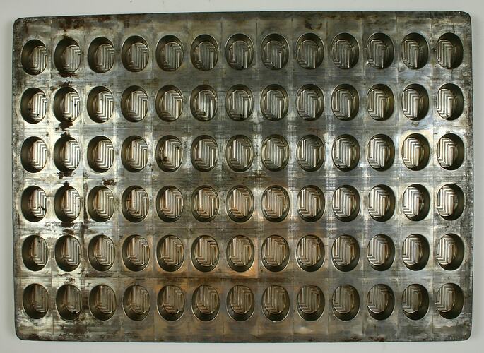 Metal chocolate mould used by the Red Tulip confectionary company to make chocolates at their factory in Melbourne in the early to mid twentieth century.
