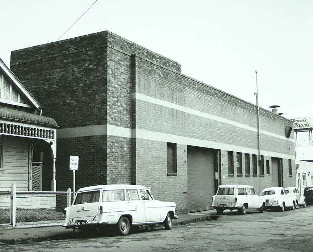 This is a streetscape of Flockhart Street in Abbotsford featuring the east face of a factory building and looking towards Southhampton Crescent with a neighbouring milk bar and the Phoenix biscuit factory tower in the distance and with parked cars and a neighbouring residence in the foreground. This building was used for the company's Reels and Sundries operations.